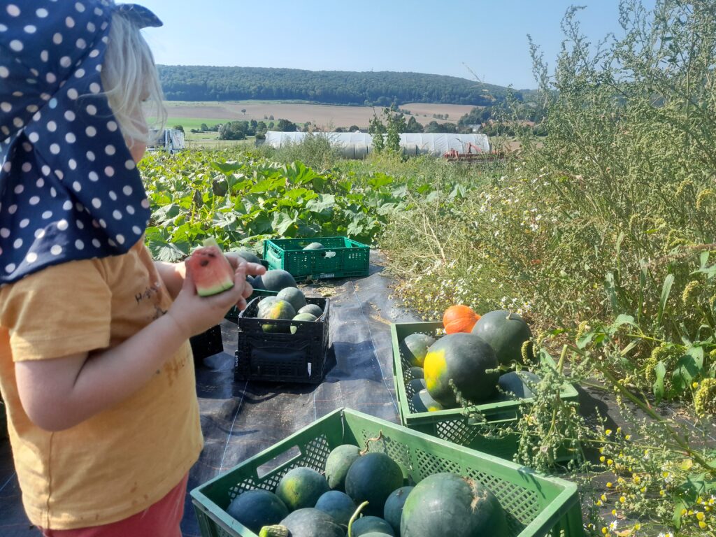 Wir bauen für euch leckere Tomaten, Paprika und Gurken in unseren 3 Folientunneln an, in manchen Jahren auch Freilandkürbisse. In dieser Saison wollen wir uns das erste Mal an Wassermelonen heranwagen.